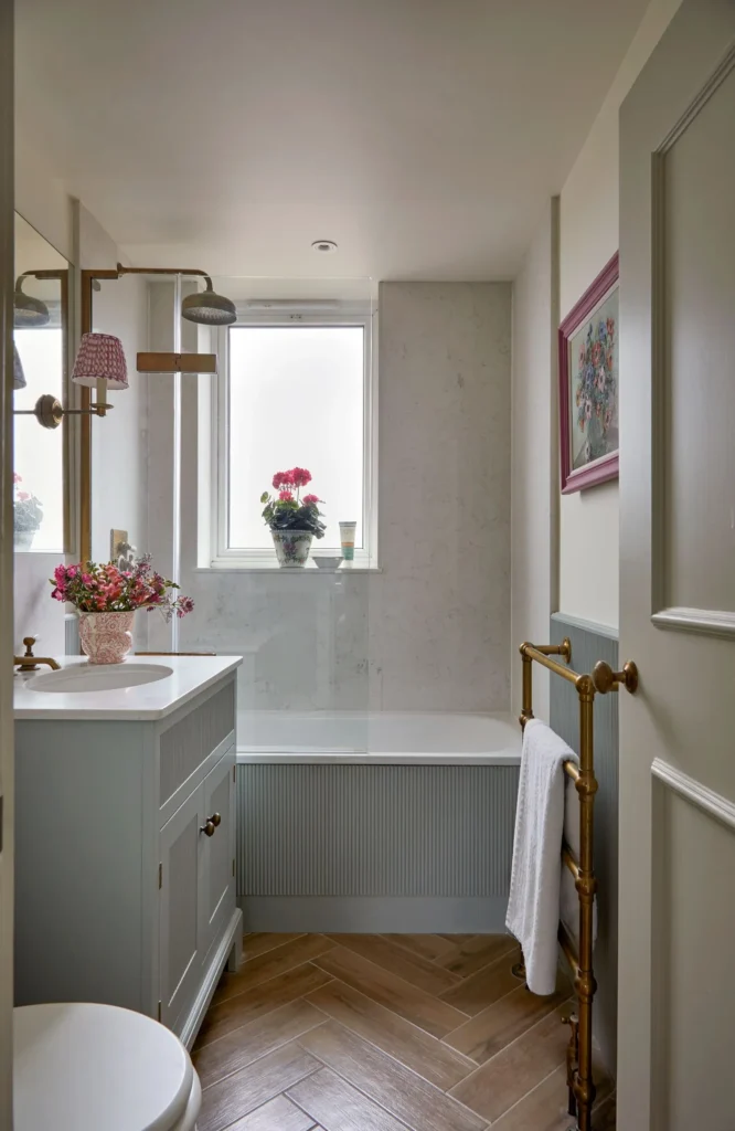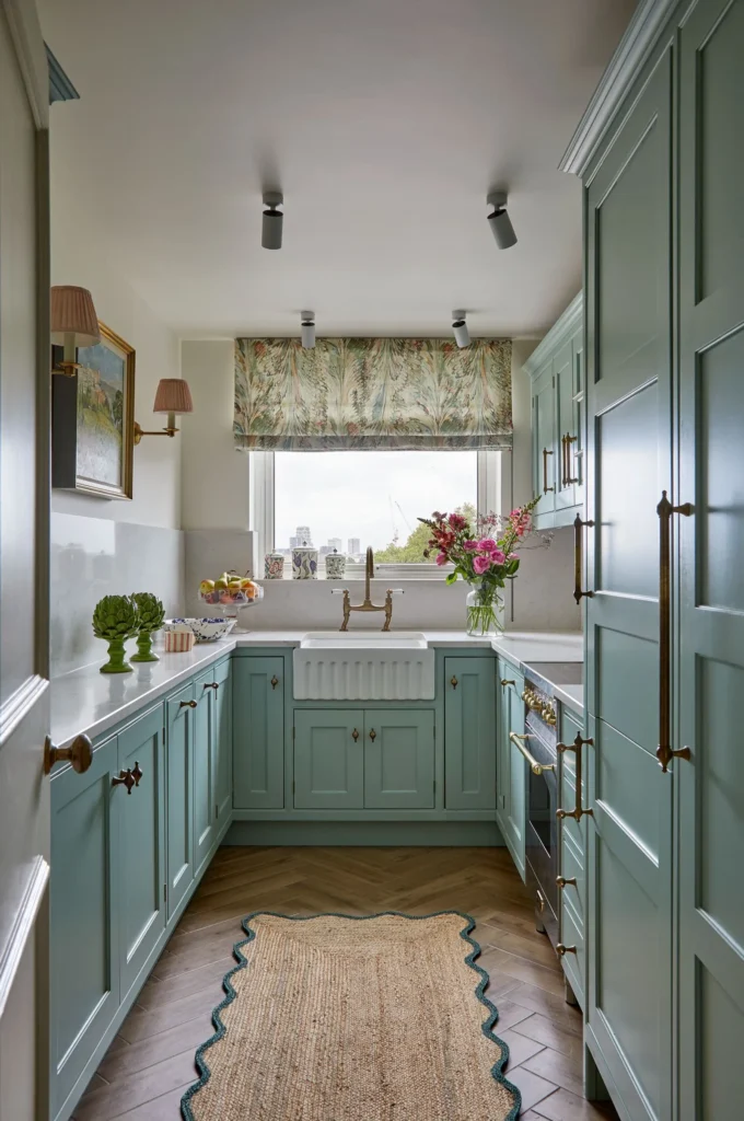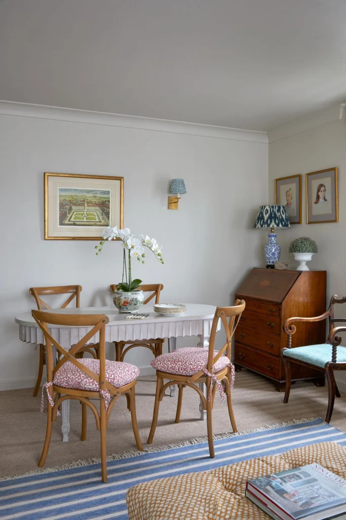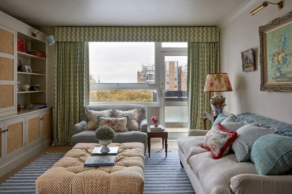 Anna designed and refurbished this two-bedroom flat in a 1960s block for a client downsizing from a long-term family home. Although the exterior was unremarkable, the flat offered wonderful views, and the brief was to create a ‘pretty and comfortable’ home. With restrictions preventing any structural changes, Anna replaced the kitchen and bathroom in their existing locations, introducing bespoke joinery to maximise both practicality and charm. Classic florals and prints reflected the client’s love of pattern, while the styling combined favourite pieces of furniture and art with new curtains, blinds and soft furnishings.